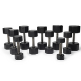 - Premium rubber encased 8-sided dumbbells