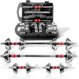 Our all-in-one dumbbell-barbell set allows you to have a versatile workout. The dumbbells can be used to sculpt your arms, while the barbell setup allows you to practice dead-lifts or squats. This product is perfect for improving overall health or encouraging weight loss. It also helps strengthen the upper body, core muscles, and lower body. The adjustable design makes it easy to stay fit at home