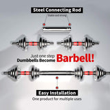 This adjustable dumbbell set comes with a connecting bar that can be easily attached to both dumbbells to transform into a barbell. There are also adjustable weight plates that let you customize the weight of the dumbbell/barbell to your desired setting. This allows you to efficiently use our dumbbell/barbell set for many exercises instead of buying multiple sets
